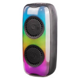 مجهز به نورپردازی RGB جهت ایجاد جلوه بصری زیبا در محیط کم نور و تاریک تامین انرژی از طریق باتری داخلی با ظرفیت ۱۲۰۰ میلی آمپر ساعتی برخورداری از ۲ عدد درایو ۳ اینچی با توان خروجی کلی ۱۰ وات (۲x۵W) قابل شارژ از طریق کابل میکرو یو اس بی همراه با ولتاژ شارژ ۵ ولت DC پشتیبانی از فلش مموری USB و رم میکرو SD به منظور پخش فایل های صوتی ذخیره شده تا حجم حداکثری ۳۲ گیگابایت امکان اتصال بی سیم از طریق رابط بلوتوث با برد اتصال تقریبی ۱۰ متری دارای میزان حساسیت سیگنال به نویز برابر با ۸۵ دسی بل، پاسخ فرکانسی در محدوده ی ۱۰۰ هرتز الی ۲۰ کیلوهرتز دارای گواهی استاندارد ایمنی و سلامت محصولات شامل CE/ FCC/ RoHs اتصال همزمان دو اسپیکر از این مدل به یک منبع بلوتوثی واحد مانند گوشی موبایل با پشتیبانی از فناوری TWS کلید های فیزیکی تعبیه شده بر روی بدنه جهت مدیریت موسیقی، تنظیم ولوم و … دارای بدنه ای ساخته شده از جنس پلاستیک با کیفیت و مقاوم در برابر فشار و ضربه مجهز به نشانگر LED جهت اطلاع از وضعیت کارکرد، دارای دسته به منظور سهولت در حمل و نقل مدت زمان نگهداری شارژ با ولوم ۷۵ درصد حدود حدود ۱ الی ۲ ساعت و مدت زمان لازم جهت شارژ دستگاه حدود ۲ ساعت امکان دریافت امواج رادیو FM در بازه ی ۸۷.۵ الی ۱۰۸ مگاهرتز برای دوستداران برنامه های رادیویی